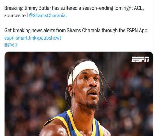 北京时间2026年1月20日下午,ESPN消息,据NBA著名记者Shams报道,勇士大将巴特勒遭遇右膝前十字韧带撕裂,赛季报销...